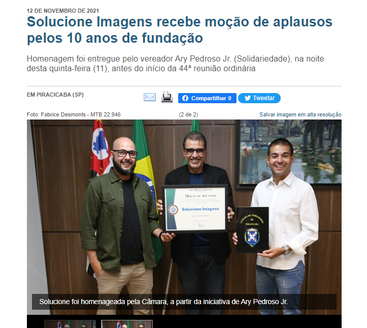 Solucione Imagens recebe moção de aplausos na Câmara Municipal de Piracicaba/SP, homenagem realizada por iniciativa do vereador Ary Pedroso Jr. (Solidariedade).