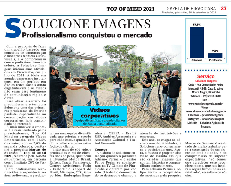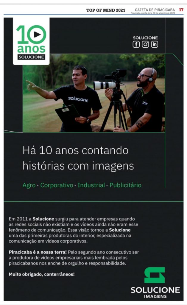 “Piracicaba é a nossa terra! Pelo segundo ano consecutivo ser a produtora de vídeos empresariais mais lembrada pelos piracicabanos nos enche de orgulho e responsabilidade. Muito obrigado, conterrâneos!”